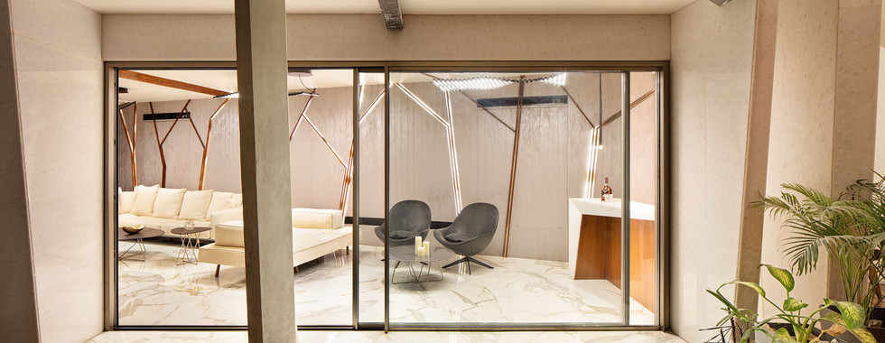 The architectural design of this northwest-facing residence in Delhi showcases a brilliant fusion of modern aesthetics, functional considerations, and innovative spatial arrangements to cater to the unique requirements of a three-generation joint family living on a narrow 326 sqm. plot. Situated amidst the bustling urban environment, this abode not only addresses the challenges of limited visual privacy and the intense city surroundings but also celebrates the idea of togetherness and openness for both family members and friends.