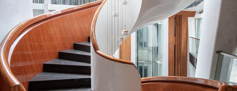 To ensure a harmonious play of light and space, the design employs a clever interplay of surfaces. The surfaces are adorned with a delicate blend of white and wood renders, imparting a sense of warmth and sophistication. The inclusion of rooftop glazing injects a generous dose of luminosity, channeling daylight deep into the basement levels, where light penetration might otherwise be challenging.