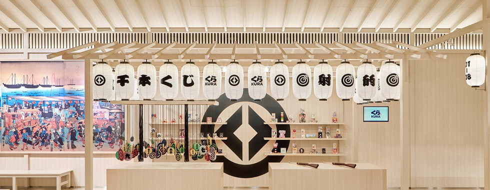 Inside, the restaurant weaves a tapestry of experiences. The waiting area exudes charm, adorned with massive ukiyo-e woodblock prints by Hiroshige Utagawa and lanterns. An entertainment area transports guests to the heart of Japanese festival culture, complete with interactive games and stalls. The seating area exudes luxury and comfort, featuring plain wood accents, semi-private spaces created by timberwork and noren curtains, and tatami mat chairs for a relaxed dining atmosphere.