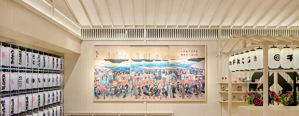 One cannot overlook the captivating "lantern wall" adorning the front facade—a radiant tapestry of 200 luminous pieces that evoke the spirit of a lively festival. Along the side of the building, a menu graphic reminiscent of sumo wrestling rankings tables pays homage to Edo merchant culture and complements the Japanese culinary experience.